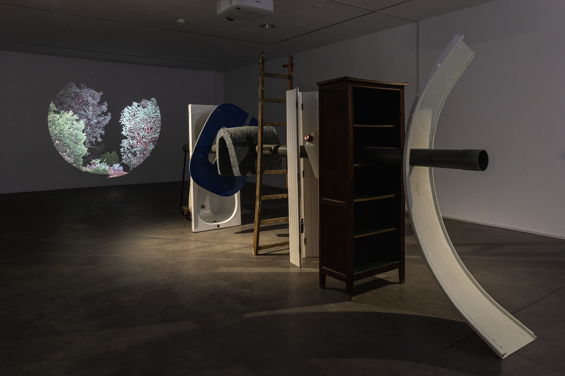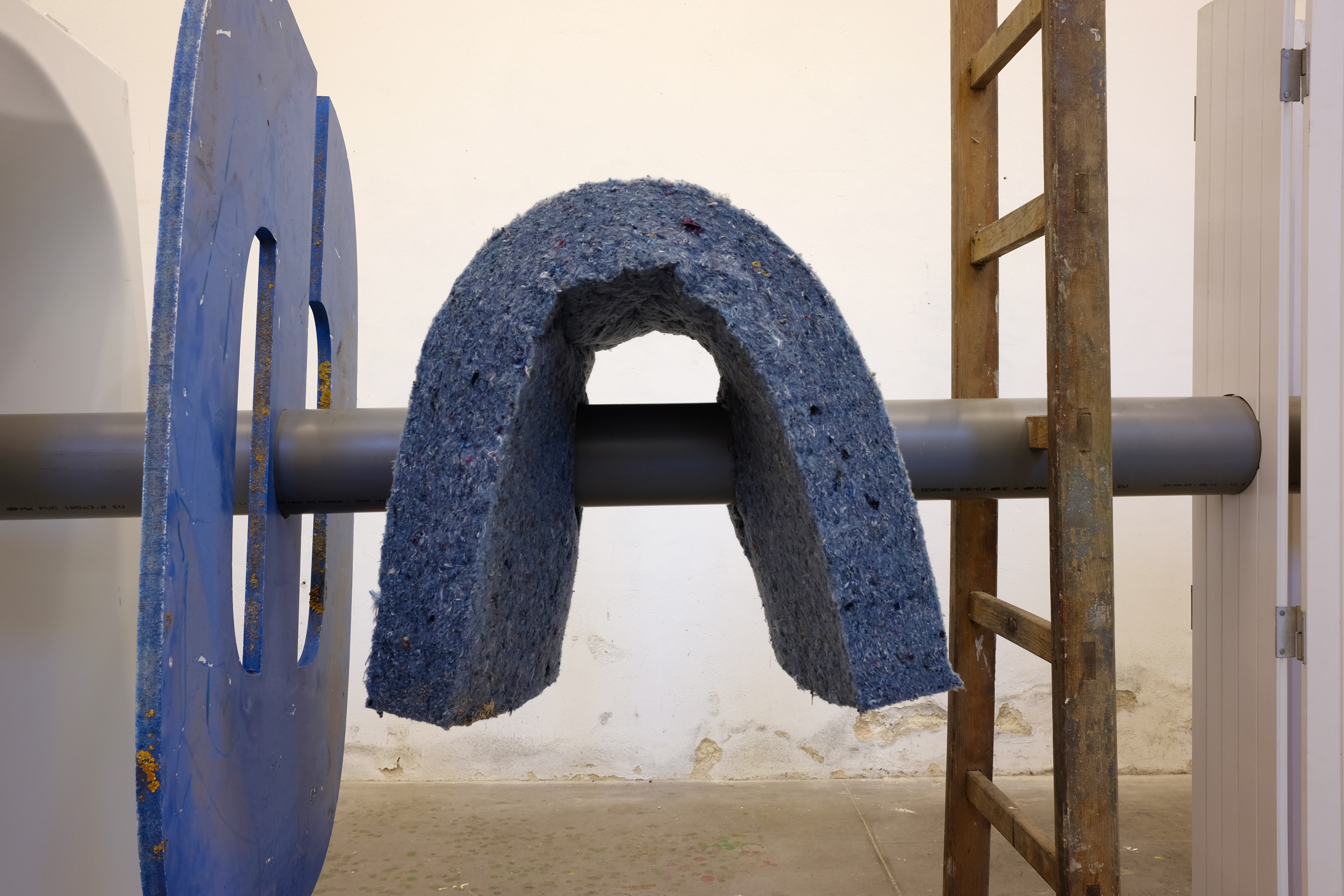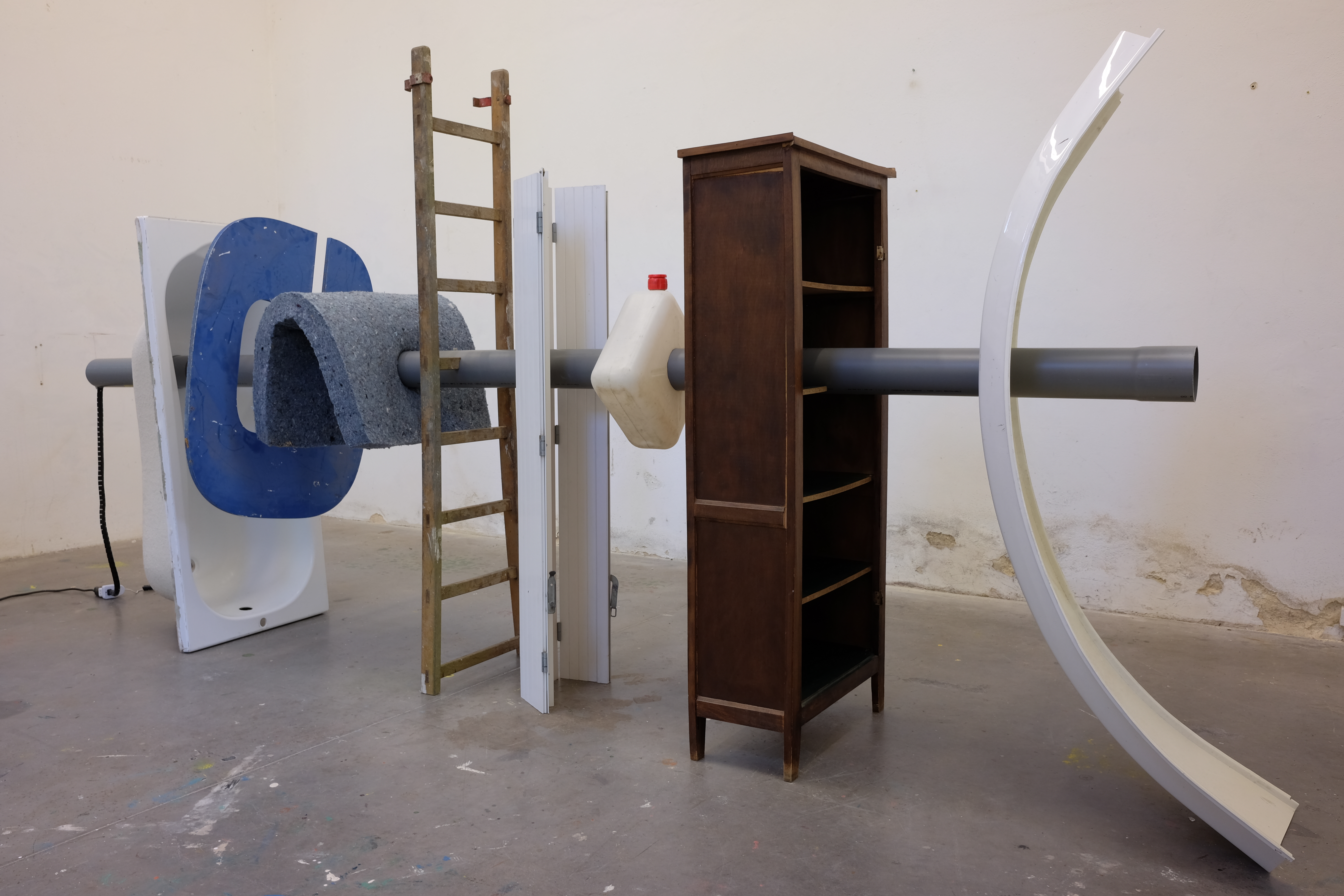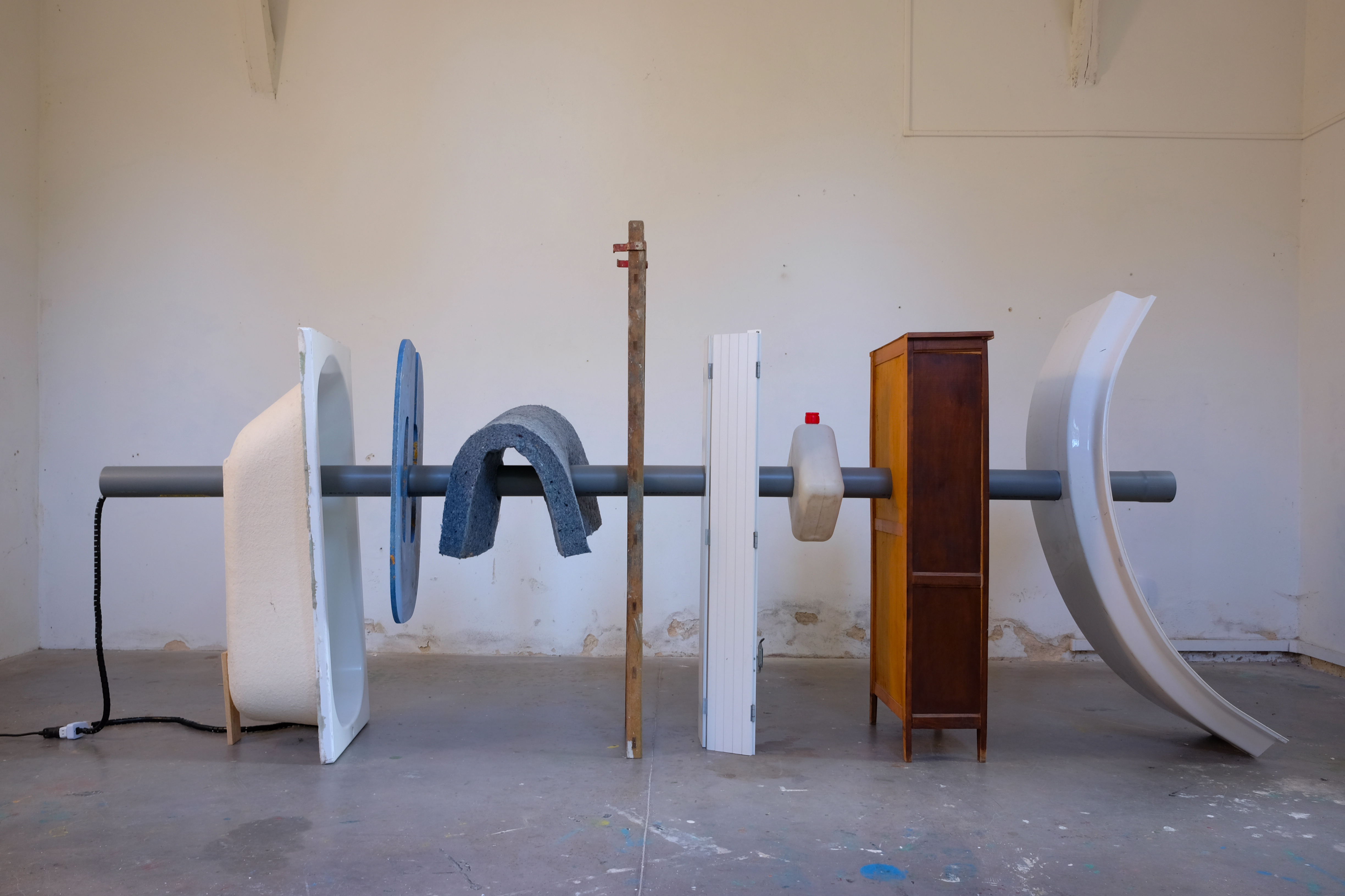 Act II: Larynx is an interactive sound sculpture constructed while in residence with the FRAC des Pays de la Loire in Nantes, Frances in the fall of 2024. This approximately four meter long sculpture is composed of large, used objects sourced from around the regions, all pierced by a drainage tube. Based on the technology of a pipe organ, the tube emits a low frequency tone that is activated by the viewer’s proximity. The objects index the local area and symbolically operate like notes on a scale. Like our throat that pierces our body so we can breath and create utterance, the tube passes through these discarded, familiar bodies and transforms wind into tone, animating their material. Act II takes up the air horn’s valve chamber – aka the larynx.